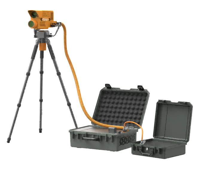 光學破拆裝置內置高能光纖激光器,能夠從地面發射激光對鋼板、鋁板、鋼筋、彩鋼瓦、樹木、塑料、馬蜂窩等進行遠距離切割清除。