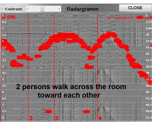 該裝置的操作原理是操作者將天線模塊導向墻壁。 然后即可在計算機屏幕上觀察當物體在墻后移動時反射信號的雷達圖的變化。