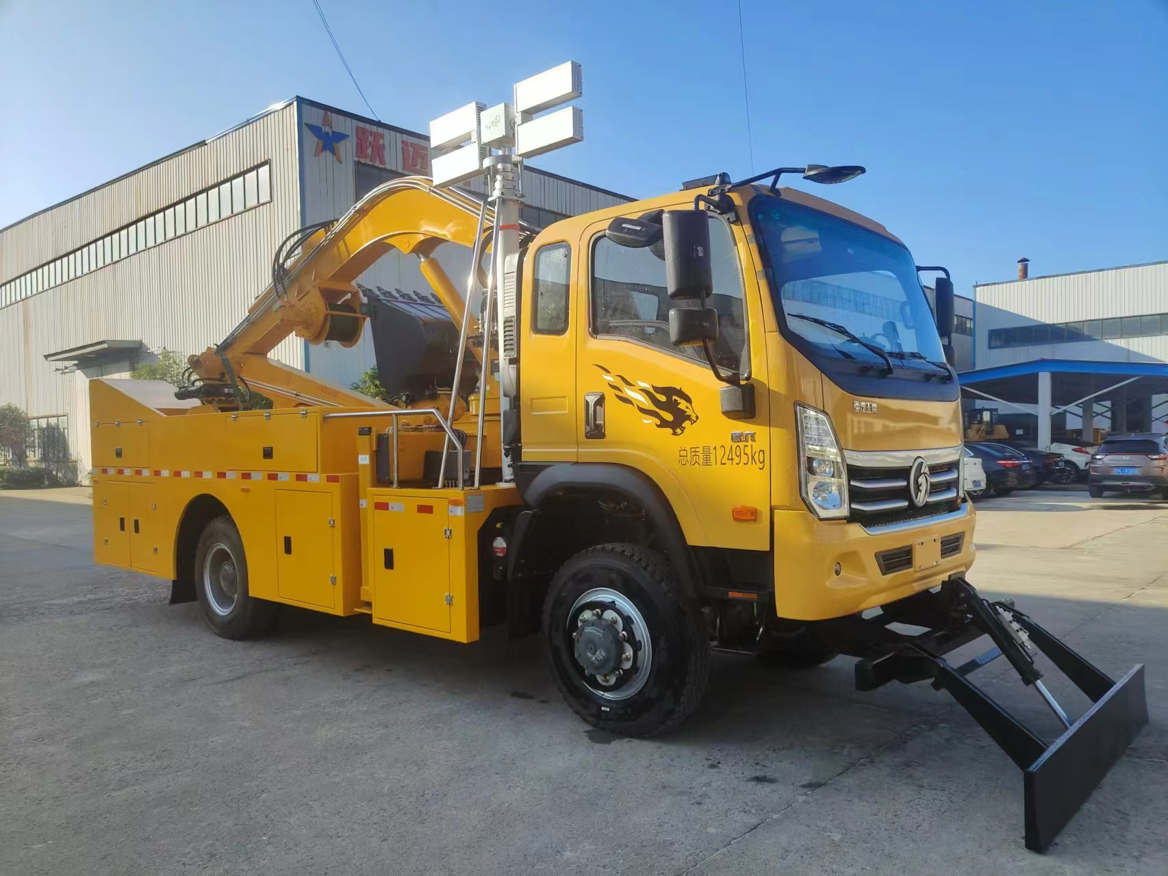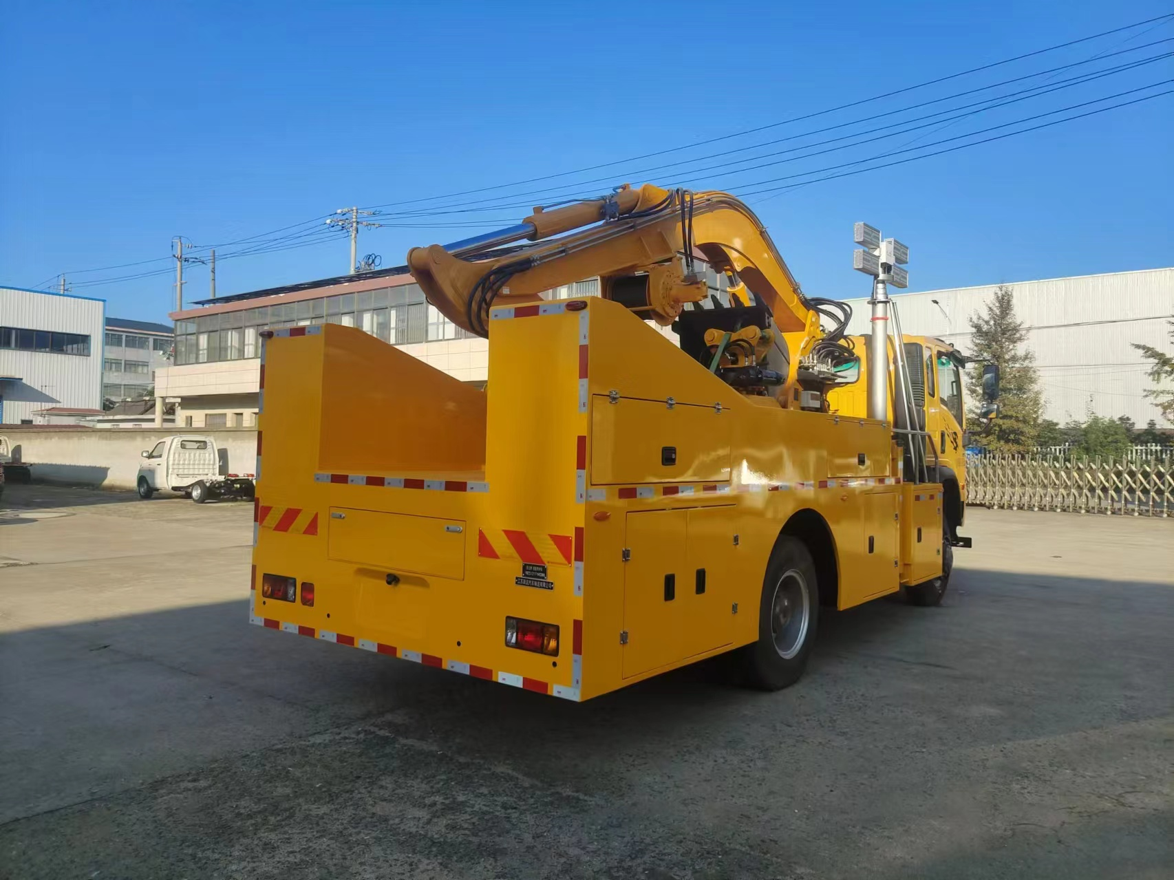 車輛配備舉升臂架、挖斗、破拆錘、抓斗、推鏟、牽引絞盤、發(fā)電機(jī)組、升降照明燈等搶險(xiǎn)裝備,實(shí)現(xiàn)多種場景的救援作業(yè);