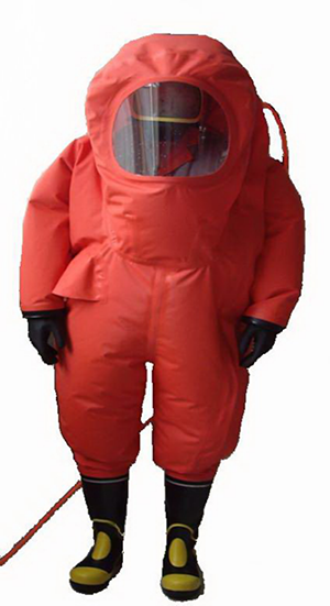 2、結(jié)構(gòu)特征:服裝為連體式全封閉結(jié)構(gòu),外置背囊可佩帶正壓式空氣呼吸器,頭部裝有單項通風(fēng)閥(排氣),接縫處牢固緊密,且用于高溫?zé)岱鈾C加溫高壓連接合縫,面屏為硬質(zhì)透明PC材質(zhì)(抗沖擊,耐酸堿)耐酸堿防化手套采用卡環(huán)可拆卸式連接,具有良好的密性,且便于更換。