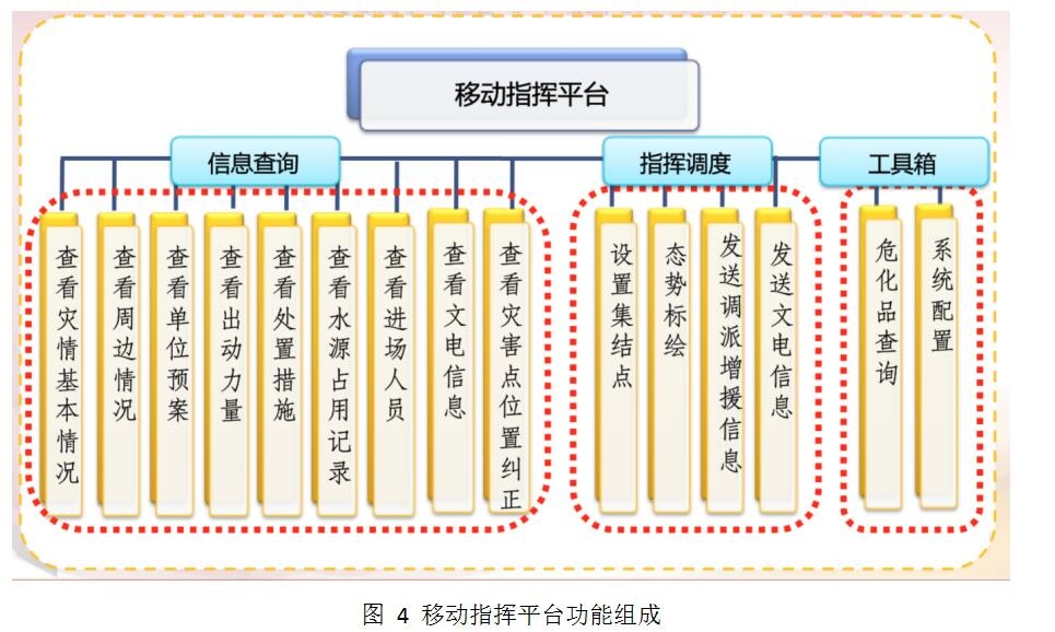 移動(dòng)指揮平臺(tái)作為支隊(duì)及以上指揮員輔助指揮與決策的工具,主要包括信息查詢(xún)、指揮調(diào)度以及工具箱三部分功能。其中信息查詢(xún)主要包括查詢(xún)案件信息的相關(guān)功能,指揮調(diào)度主要包括發(fā)送指令的相關(guān)功能,工具箱包括危化品查詢(xún)和系統(tǒng)配置。移動(dòng)指揮平臺(tái)的功能組成如下圖所示: