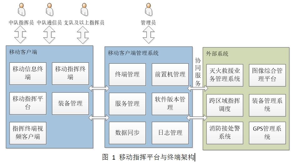 移動(dòng)指揮平臺(tái)及終端與指揮網(wǎng)現(xiàn)有的業(yè)務(wù)管理系統(tǒng)、跨區(qū)域指揮調(diào)度系統(tǒng)、消防接處警系統(tǒng)、圖像綜合管理平臺(tái)、裝備管理系統(tǒng)以及GPS管理系統(tǒng)對(duì)接,實(shí)現(xiàn)了消息的互通,整體架構(gòu)如下圖所示: