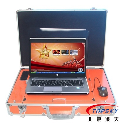 開式手提箱結構,箱體上蓋部分為資料存放處,下箱體部分的上層為筆記本電腦操作平臺,右側為鼠標工作平臺,左側為音箱控制區域,下箱體的下層部分為一起設備存放區域;