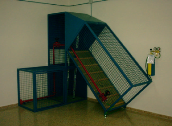 此裝備可以模擬各類尺寸偏小的坡度可變的巷道(0-45度),巷道內行進方式為爬行或者側行根據巷道擺放形式不同,內部采用摩擦系數較大的塑膠鋪成,方便人員行動。外側有手扶爬梯,人員在下部進入上部走出進行計量,可以自動計算人員規定時間內的行走次數。