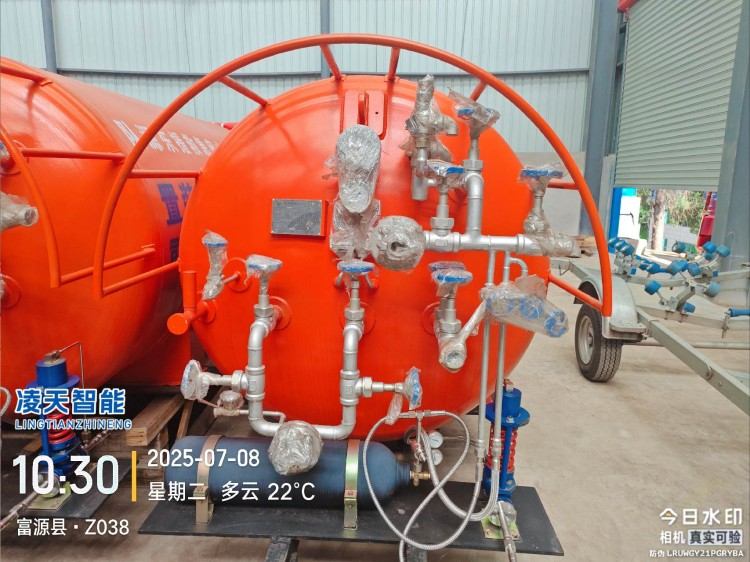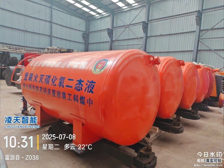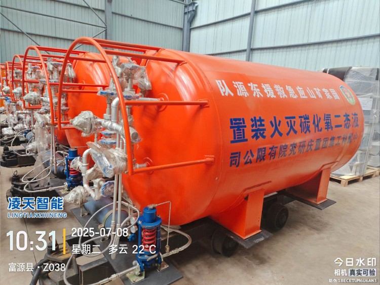 液態(tài)二氧化碳滅火裝置,采用平板車為運(yùn)載平臺,搭載液態(tài)二氧化碳滅火模塊,采用液態(tài)二氧化碳為滅火劑,運(yùn)輸至井下火區(qū)近附,經(jīng)自增壓調(diào)控系統(tǒng)實(shí)現(xiàn)罐內(nèi)穩(wěn)壓,并通過遠(yuǎn)距離輸送管路將液體從罐內(nèi)向密閉火區(qū)噴射,利用其急速膨脹氣化和吸熱效率高的物理特性,可實(shí)現(xiàn)惰性降氧,吸熱降溫,吸附阻化等功能,從而可快速進(jìn)行井下煤層自燃火災(zāi)的預(yù)防與撲滅等。
