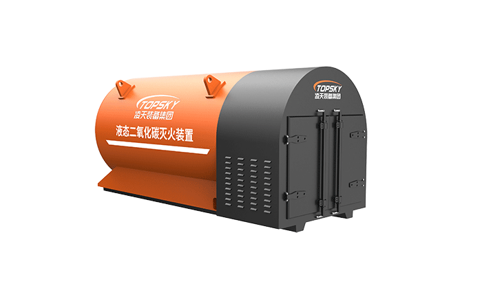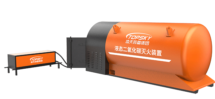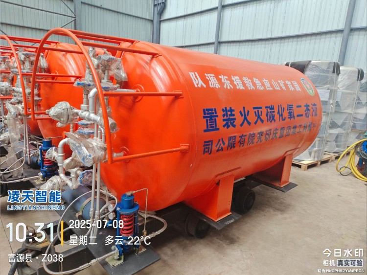 液態(tài)二氧化碳滅火裝置,采用平板車為運(yùn)載平臺,搭載液態(tài)二氧化碳滅火模塊,采用液態(tài)二氧化碳為滅火劑,運(yùn)輸至井下火區(qū)近附,經(jīng)自增壓調(diào)控系統(tǒng)實現(xiàn)罐內(nèi)穩(wěn)壓,并通過遠(yuǎn)距離輸送管路將液體從罐內(nèi)向密閉火區(qū)噴射,利用其急速膨脹氣化和吸熱效率高的物理特性,可實現(xiàn)惰性降氧,吸熱降溫,吸附阻化等功能,從而可快速進(jìn)行井下煤層自燃火災(zāi)的預(yù)防與撲滅等。