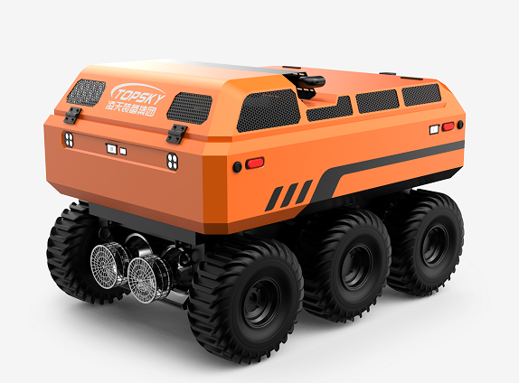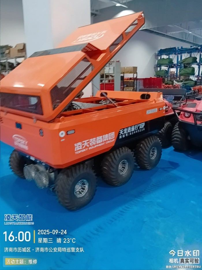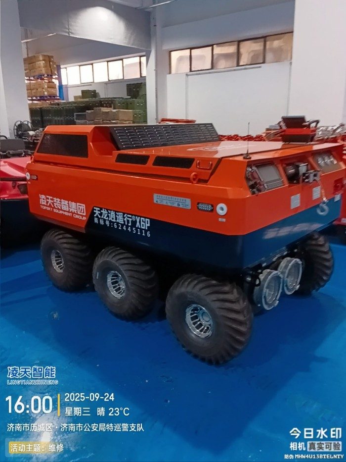 水陸兩棲 采用6×6輪式+履帶底盤,液壓驅動,水陸兩棲,可全地形行駛。可在水上漂浮行進,適合多種救援場景,輪胎+履帶兩用底盤(履帶可快速拆裝)。