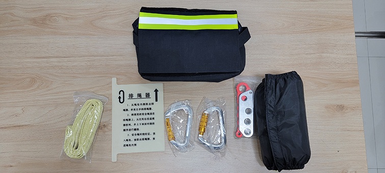 套裝構(gòu)成:1根安全繩,2個(gè)安全鉤,1個(gè)下降器,1根扁帶,1個(gè)排繩器,1塊包繩布,1個(gè)多功能阻燃繩包。